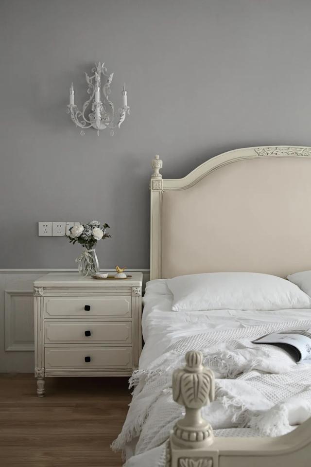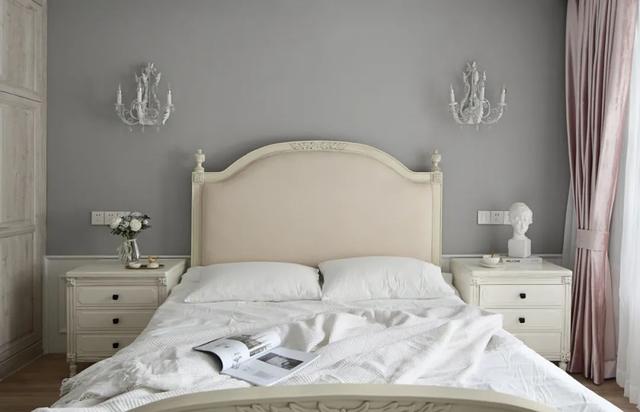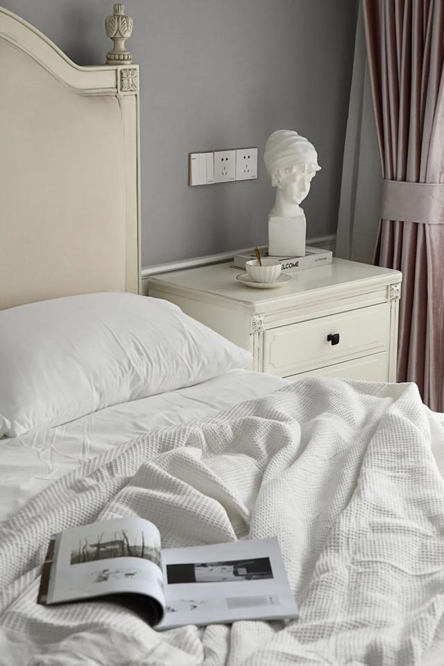 主卧还是延续一个色彩饱和度极低的色调,营造温柔舒适的睡眠环境。