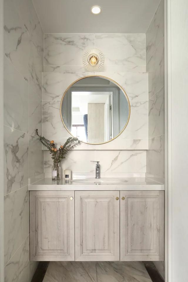 卫生间干湿分离。干区除了顶光源我们还设计了暗藏式的灯带,将面光源均匀分布,方便于女孩子收拾精致的妆容~