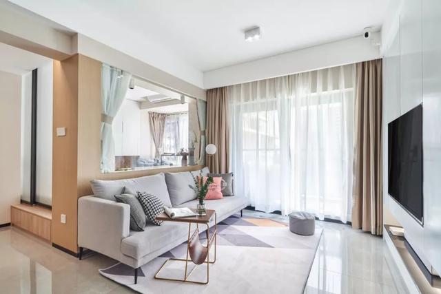 ▲ 客厅以白色为基调,入嵌式的电视柜更加节省空间,也更加实用,白色的门框,也让视野更加开阔。