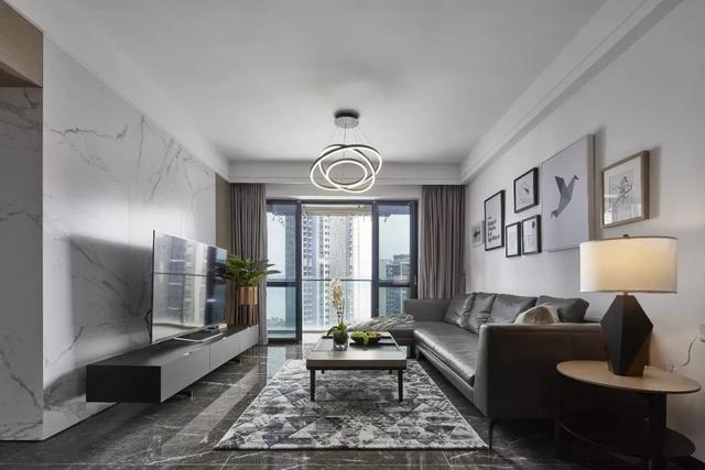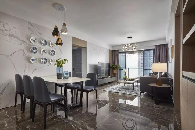 餐厅的边上就是客厅,同样也是用大理石作为电视背景墙,灰白色又带有独特纹理的大理石,让整个家都非常有时尚的感觉。