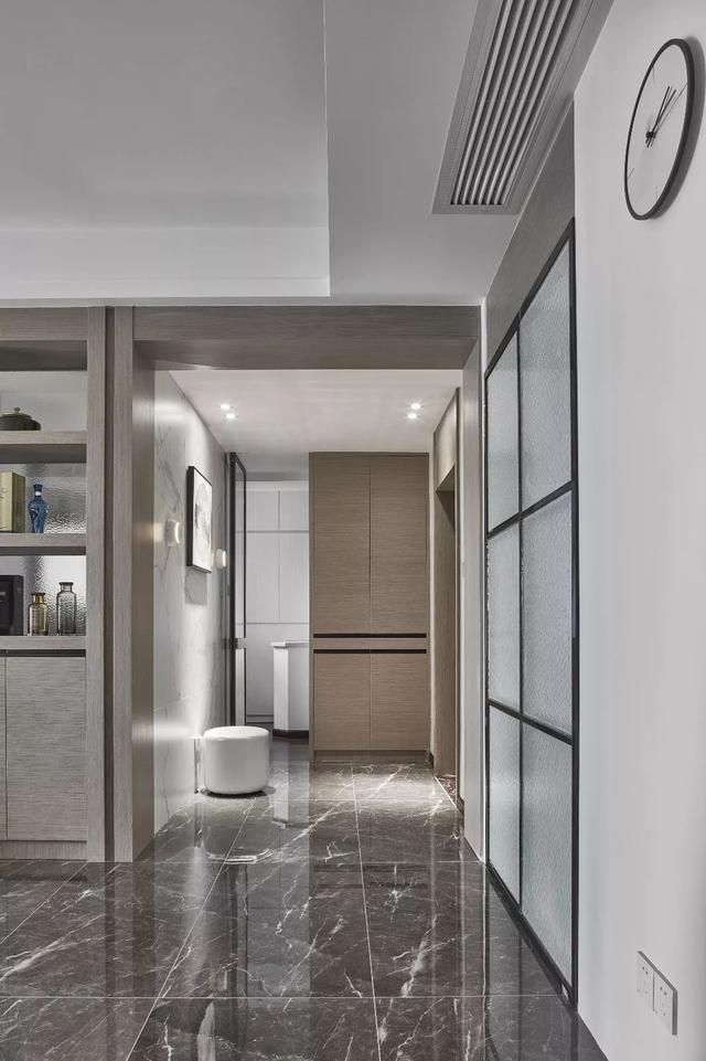 入户的玄关走廊,嵌入式的到顶鞋柜和大理石的背景墙搭配起来,让玄关走廊空间在实用之余,也增添了大气、奢华的感觉。
