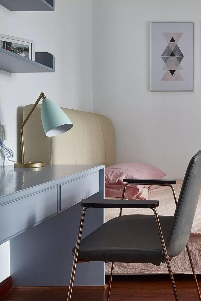 女孩房选择了粉色和金属色的搭配,让人感觉浪漫而又奢华,简约的挂画和隔板书桌的设计也非常的美观、实用。