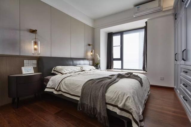 主卧室的的床头背景墙用硬包和护墙板来组成,在柔和的感觉中又加上质朴的感觉。床尾处直接到顶的嵌入式衣柜,非常的实用。
