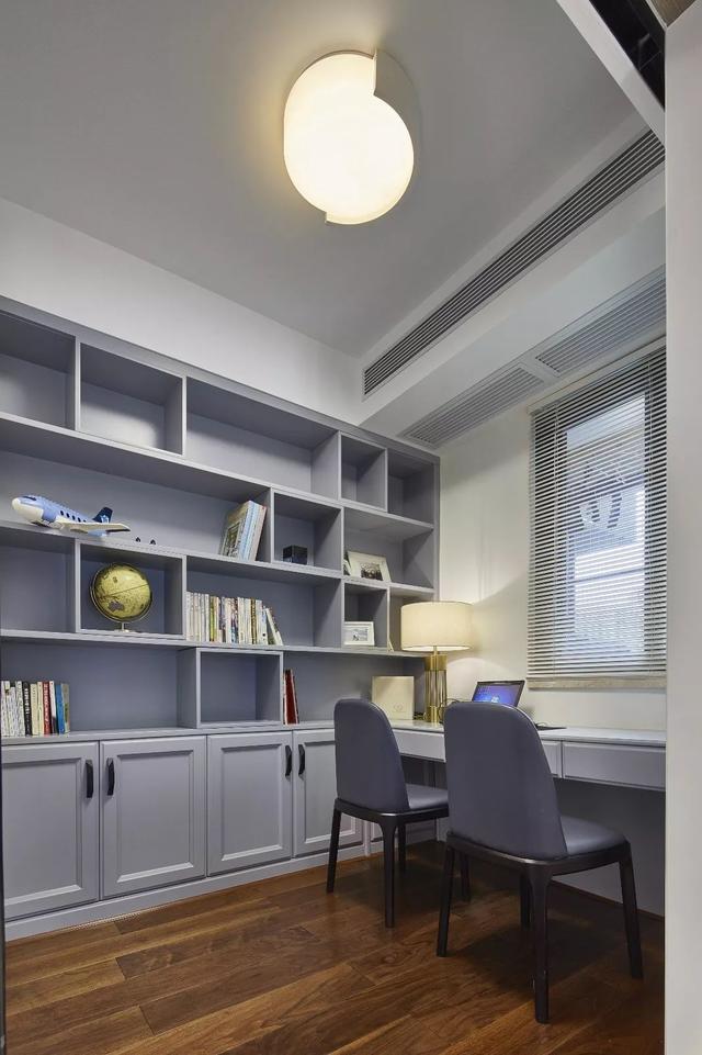 房子里还有一个独立的书房,靠窗摆放双人书桌,嵌入墙面的书架,和卧室门一样颜色的设计,让整个空间的整体感变得更强。