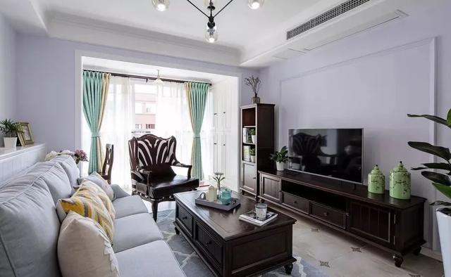 客厅电视背景墙并没有做太多的装饰,觉得美式风茶几、电视柜和单椅与浪漫的背景墙、沙发和地毯的对比就是最好的装饰效果了。