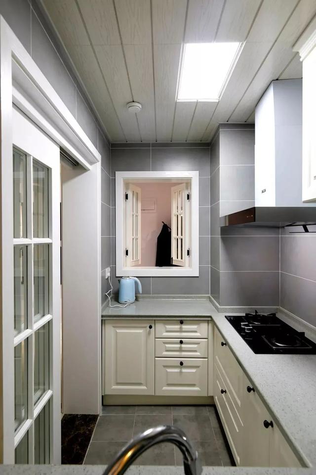 厨房和餐厅之间用玻璃推拉门隔开,避免油烟的问题。在玄关和厨房之间还开了一个窗口,把两个空间连通,更显宽敞。