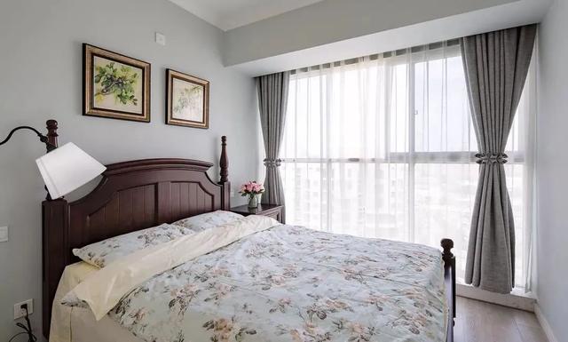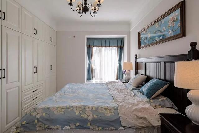 主卧同样选择了厚重的美式家具和浪漫的软装、背景墙的搭配,还在床尾处设计了到顶的嵌入式衣柜,收纳空间非常充足。