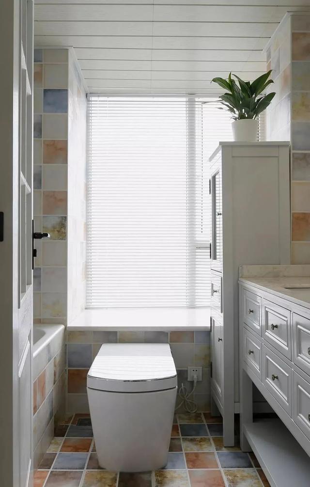 最后是用仿古砖打造的卫生间空间,洗手台和浴缸分列马桶的两侧,洗手台还连着收纳柜一起设计,满足卫生间的收纳需求。