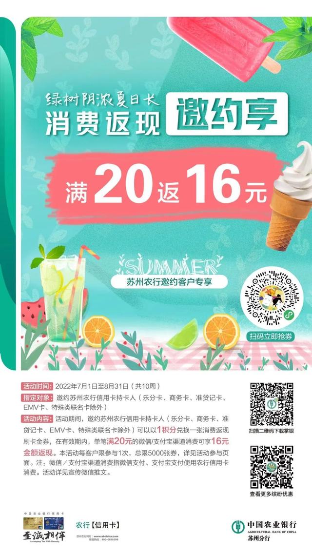 活动期间,邀约苏州农行信用卡持卡人(乐分卡、商务卡、准贷记卡、EMV卡、特殊类联名卡除外)可以以1积分兑换一张消费返现刷卡金券,在有效期内,单笔满20元的微信/支付宝渠道消费可享16元金额返现。