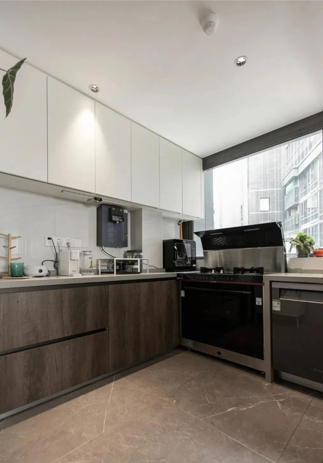 将小阳台纳入厨房,使得厨内获得更多可操作的自由活动空间。为了最大程度地避免油烟外散到公共空间,厨房选用了集成灶的烹饪形式。