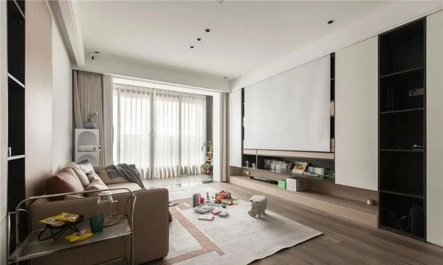 电视墙定制了满墙收纳柜,封闭式与开放式相结合,收纳展示功能兼具。顶部安装了投幕,相比电视更省空间,而且可以带来更好的视觉体验。