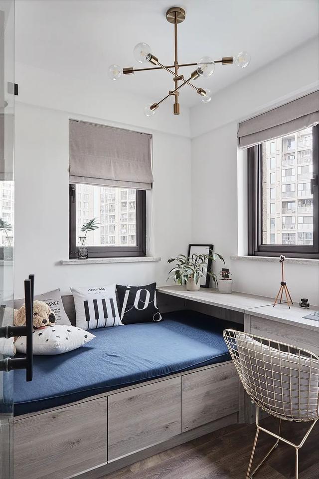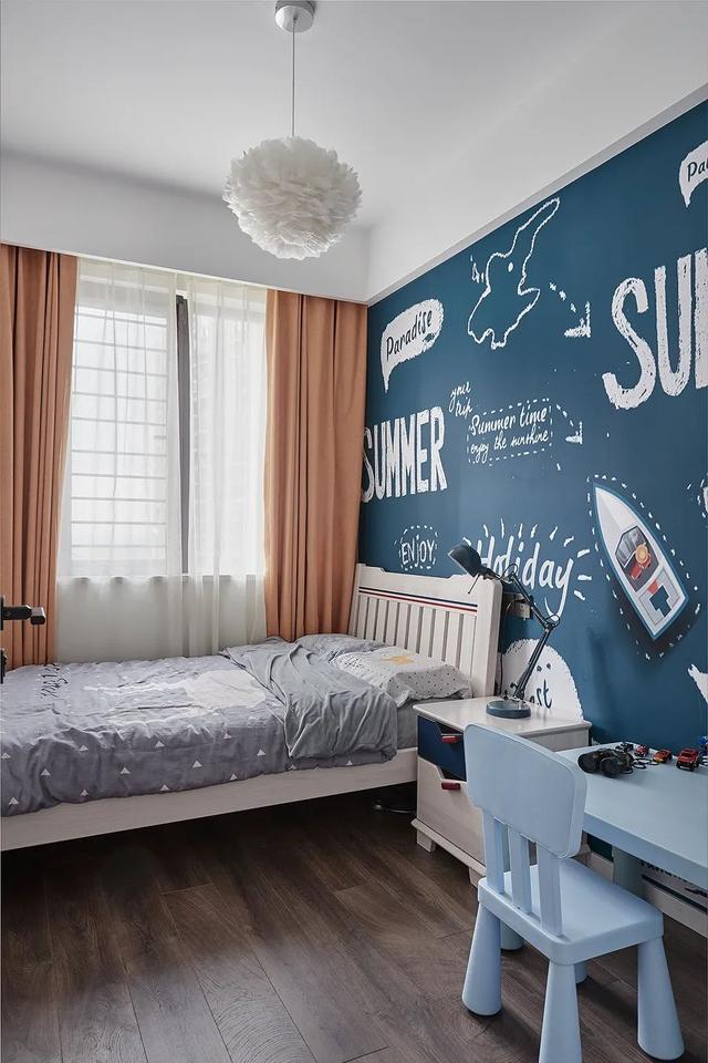 ▲海军风的床,撞色中黄的棉麻窗帘,柔和的羽毛灯都显得整个空间童趣盎然,为宝宝营造温馨舒适的氛围。
