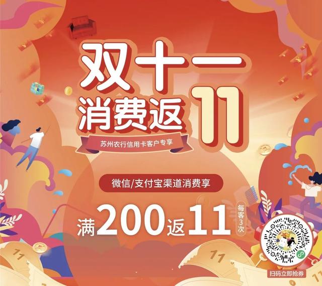 活动期间每日9点起,苏州农行信用卡持卡人(乐分卡、商务卡、准贷记卡、EMV卡、特殊类联名卡除外)可以6积分兑换一张消费返现刷卡金券,兑换成功5分钟后,在有效期内,单笔满200元的微信/支.付.宝渠道消费可享11元金额返现,每客户每周限参与1次,活动周期内限参与3次(每张券返1笔)。活动期内每周限5000张券,共15000张券,用完即止。