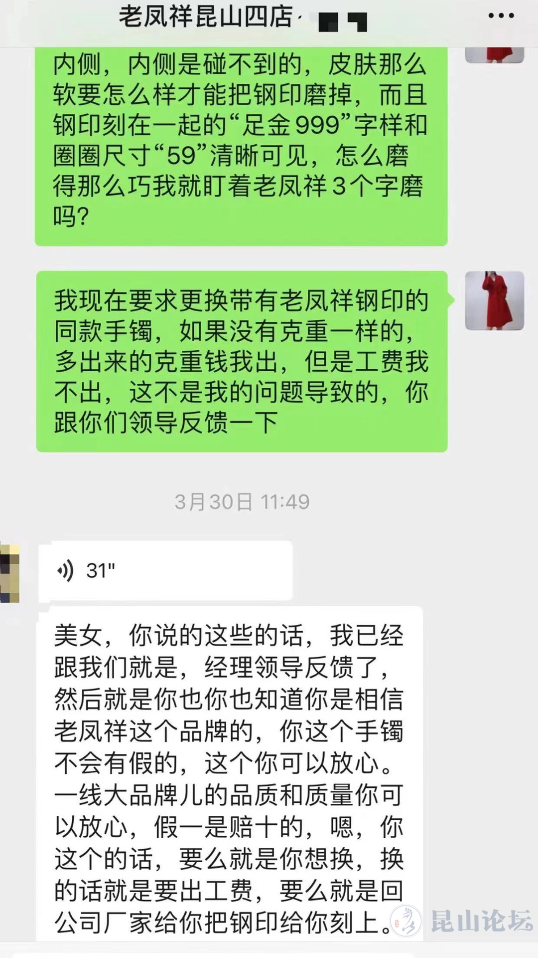 我现在就想她们能给我换个同款的,没有一样克重的多出来的克重我付钱,工费我不承担,古法工艺手镯老凤祥现在工费80/克,工费要几千块,你们的失误凭什么要我承担?