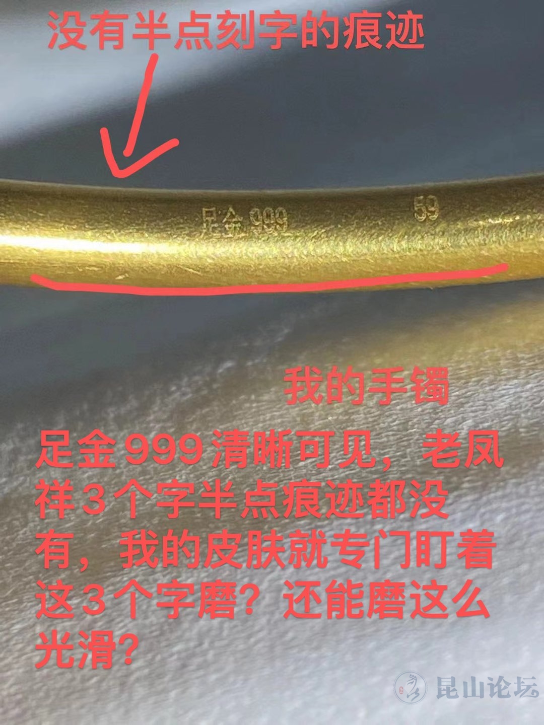 3月底项链断了,想去老凤祥换一根,就跟跟朋友聊到老凤祥黄金,朋友去年刚买一个手镯,就拍照给我看,上面有“老凤祥 足金999”和圈口尺寸字样,之前我也是买的老凤祥手镯,出于好奇心我也看了一下,不看不知道,一看吓一跳,只有“足金999”字样和圈口尺寸字样,没有老凤祥3个字,买的时候营业员也没跟我说起,我也不懂,我就立马咨询老凤祥的营业员,(之前有加过微信),她跟我说只要是老凤祥买的,就肯定有老凤祥字样的钢印,让我拿去给她看一下,说是不是磨得不清晰了,我当天晚上就去她们店里给她看,结果她也没找到“老凤祥”字样,连一点刻印在痕迹都没有,然后就跟我说,是我带了磨掉了,钢印是朝里面的,而且“老凤祥 足金999”和圈口尺寸字样是刻印一起的,手镯带在手上位置也是一直有变动的,难道我的手就盯着老凤祥3个字去磨吗,而跟它刻在一起的“足金999和圈口尺寸”清晰可见,钢印是在内侧,我的皮肤是沙皮纸吗?然后又说可能出厂时漏刻了。
