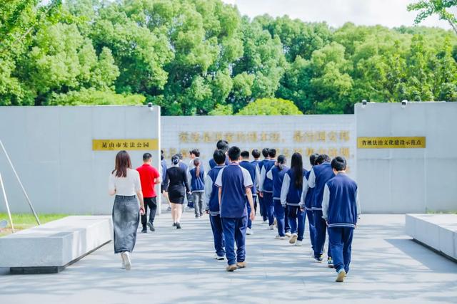 在解说员的带领下,学生们来到宪法公园。宪法公园是一座表达昆山人民尊崇宪法的广场,是展示宪法精神与城市形象的场所。大家一起走过宪法主题墙,走近宪法历史长廊,回顾我国宪法与时俱进的光辉历程。