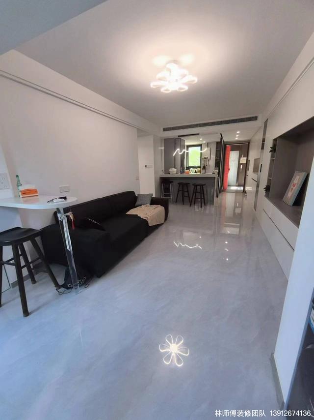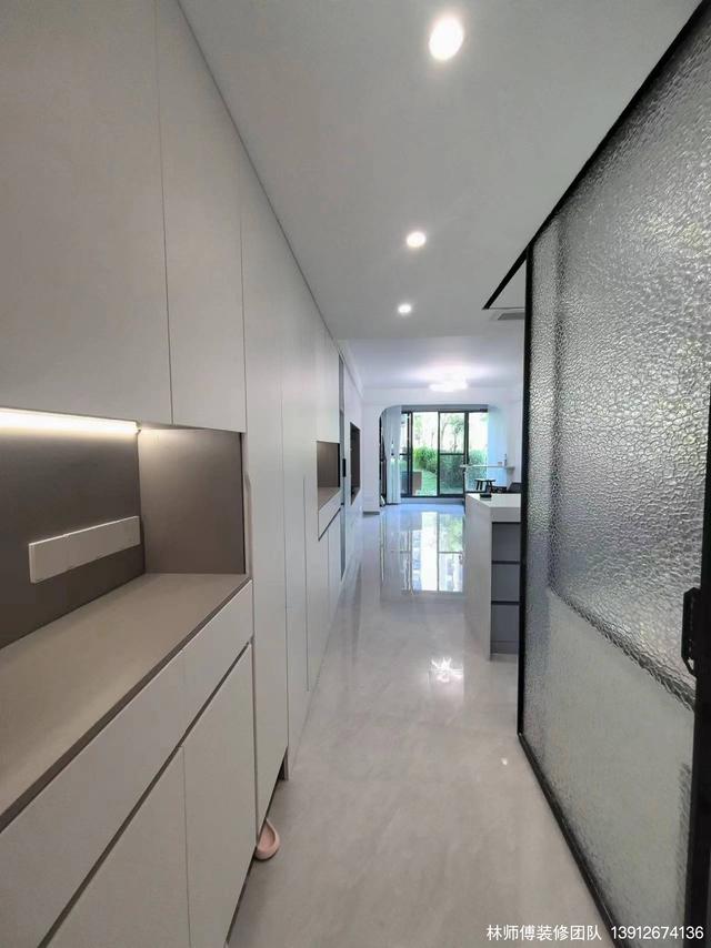 入户与客厅之间没有墙体,呈长条形分布,设计时玄关柜连接餐边柜和电视柜,一字型设计,收纳能力超高,实现了家庭收纳的“半壁江山”。也让整个空间看上去更加简洁规整。