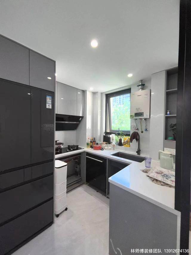 厨房内部u形设计,当你置身其中,三面挨着操作台,洗切煮的操作都在转身之间即可以完成,非常方便。而且收纳也做了非常的多,开放式和封闭式,让储物变得更加便利。