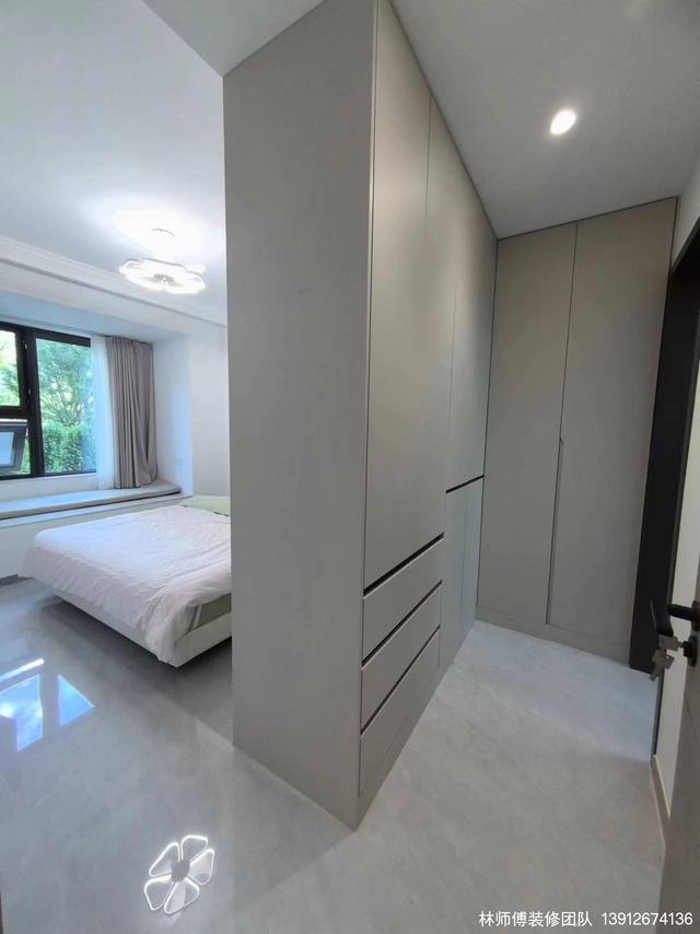 主卧有一个衣帽间,到顶的衣柜收纳能力超强。素雅的四件套,清爽又舒适,飘窗上做了软垫,平时可以在这里喝茶看书,享受安静的独处时间。