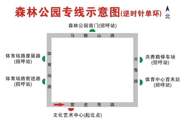 线路站点:文化艺术中心、体育中心首末站 (招呼站)、共青路停车场(招呼站)、森林公园南门(招呼站)、体育场路康居路(招呼站)、体育场路前进路(招呼站)