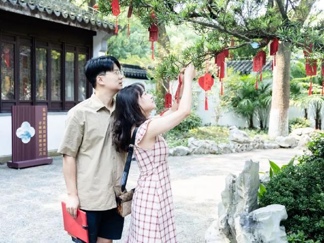 “比翼双飞关雎鸟,并蒂花开连理枝。”去年七夕揭幕的亭林园结婚登记点迎来了首个周年打卡日。活动现场,工作人员为前来打卡的市民朋友准备了精美的打卡纪念章、结婚相框和有着美好寓意的祝福许愿牌,10对去年七夕当日在亭林园结婚登记点办理结婚登记的新人在亭林园预约凭证上盖上1周年结婚纪念章,烙下爱的印记;在许愿牌上写满对家人的祝福和未来的期许,共同悬挂在不老松下,爱的仪式感满满!