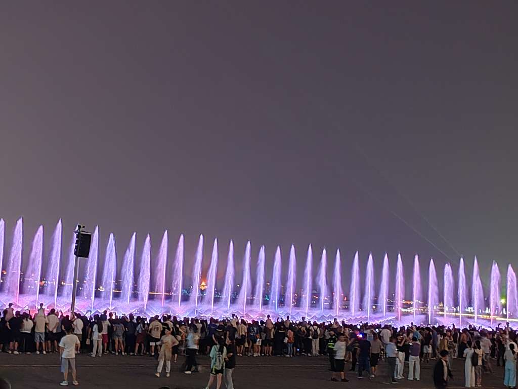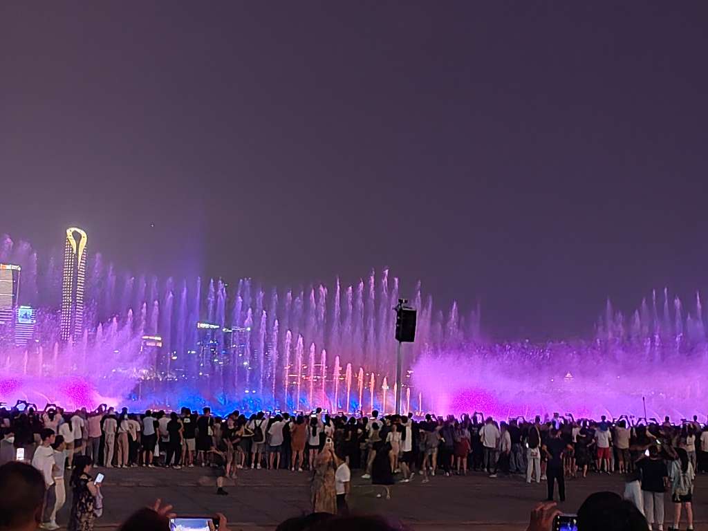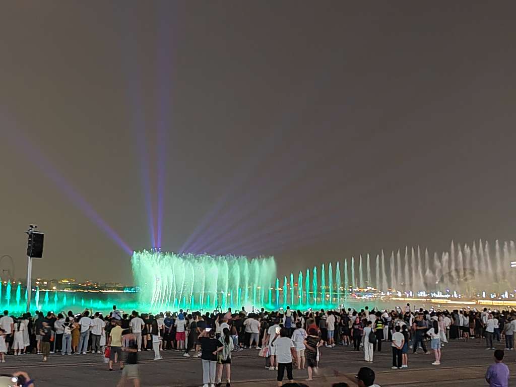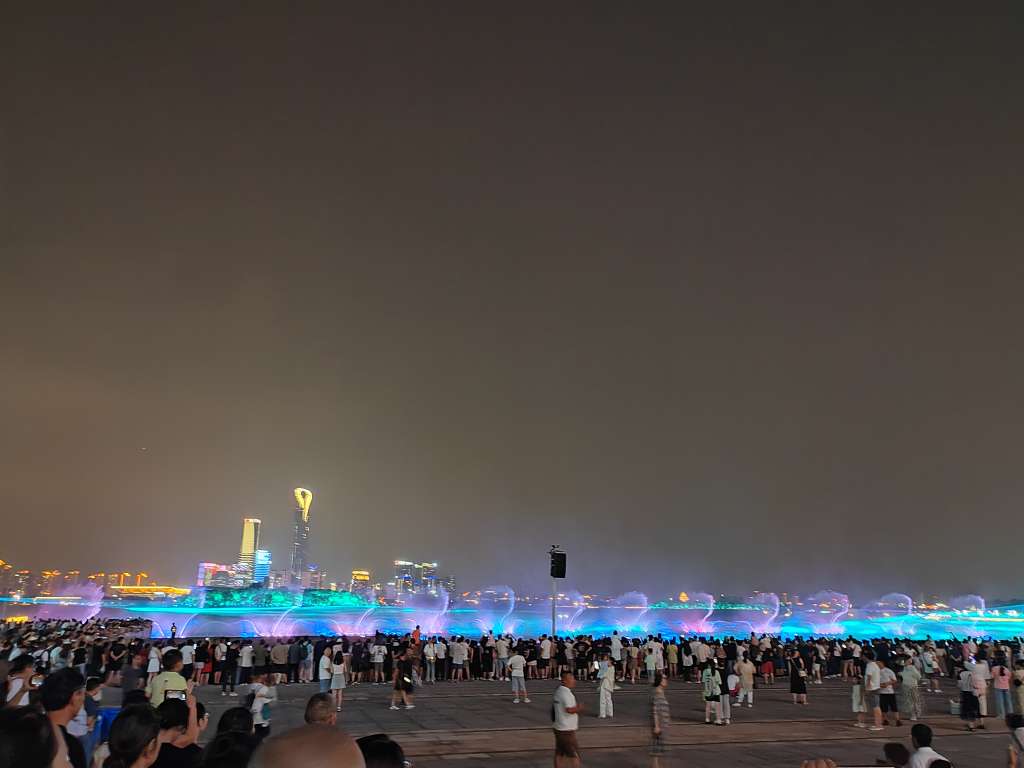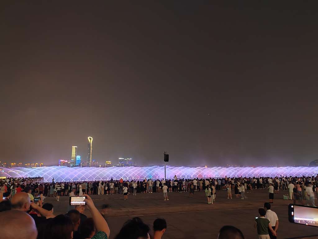 。五点半左右到的,还等了十几分钟。人多上菜也慢,一直到七点多才上齐,周边几桌最后都是把鸭架直接打包了。看看时间差不多七点半,散步来到金鸡湖等喷泉,其实本来是想去栈桥那边的,吃过饭就不高兴动了。等到八点,准时开始,我怕回程地铁人多太拥挤,提前六分钟走人,一点儿也不挤