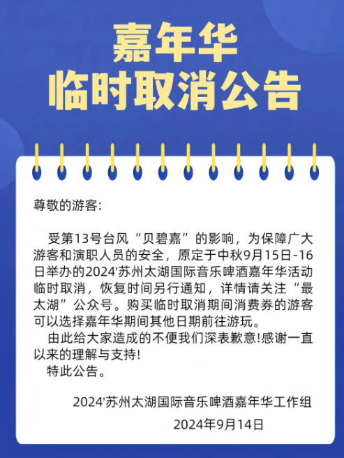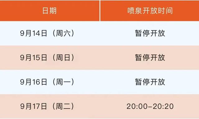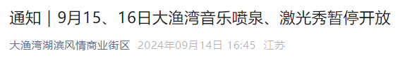 至16日金鸡湖音乐喷泉暂停播放。9月17日金鸡湖音乐喷泉播放安排将视天气情况决定。