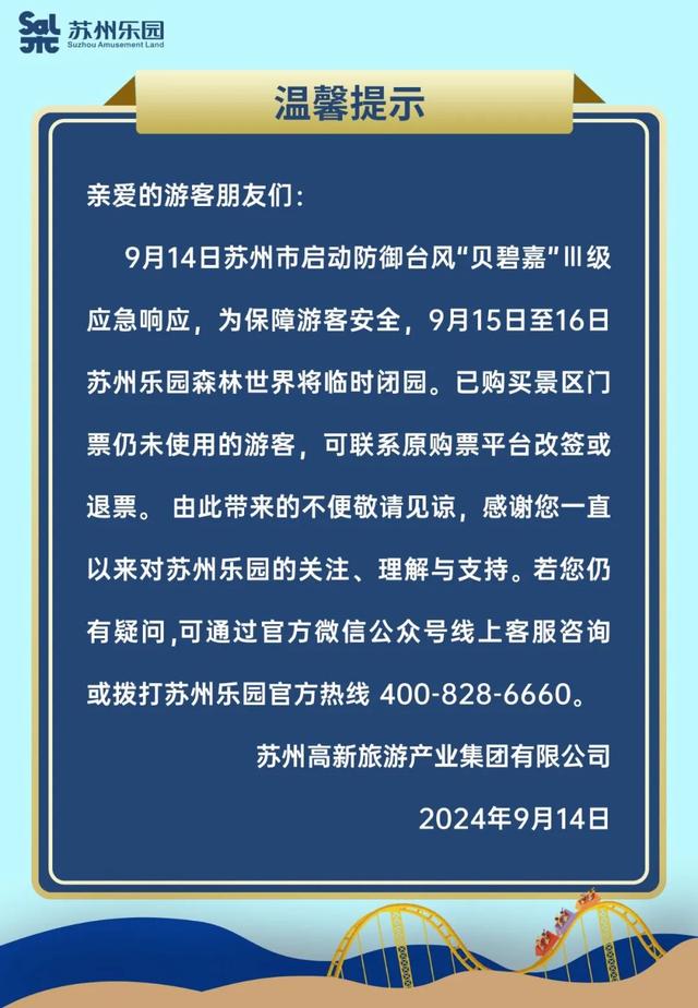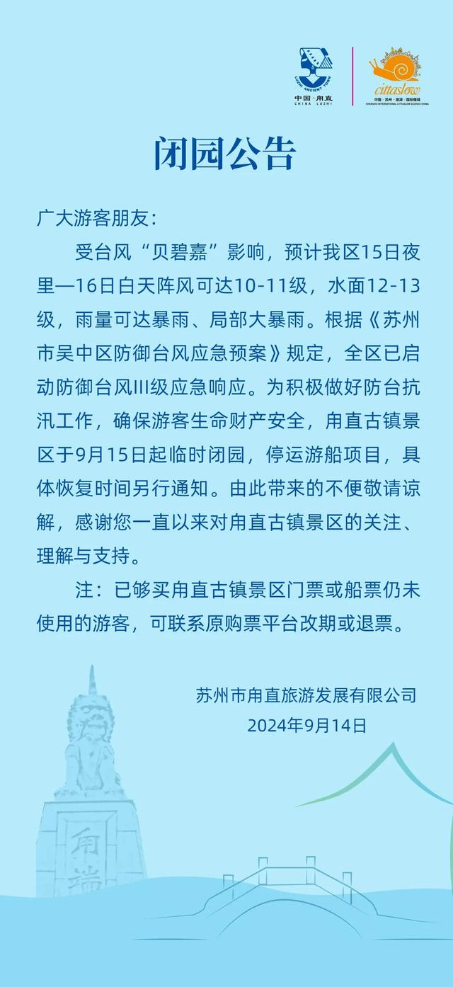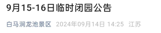 雨花胜境、陆巷古村景区于2024年9月15日至9月16日闭园两天。已订购门票的游客,如需退订或改签可联系原购票平台退改签,如有疑问请致咨询电话:0512-66394308(陆巷)、0512-66396050(雨花)。
