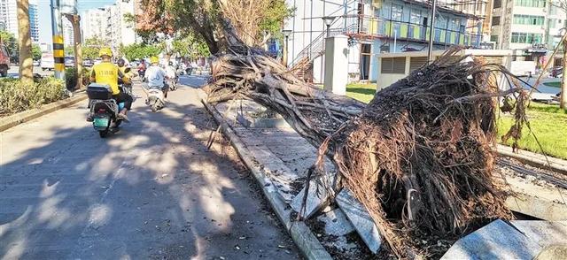 海口滨涯路上完成枝条修剪等待扶正复种的榕树。记者 王康景 摄 图源:海南广播电视总台