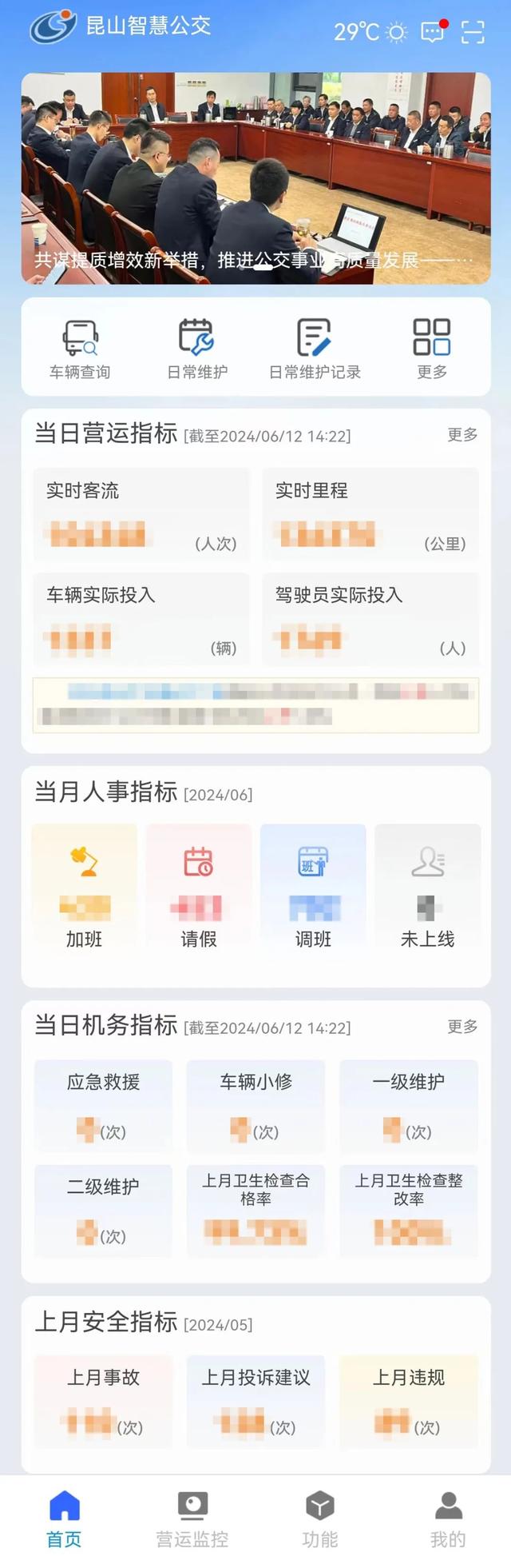 昆山智慧公交APP全新升级,运营、人事、机务、安全各重要指标在首页集中展示,同时增加功能分类,将机务、安全、运营等业务进行整合,整洁直观,查看更加方便快捷。