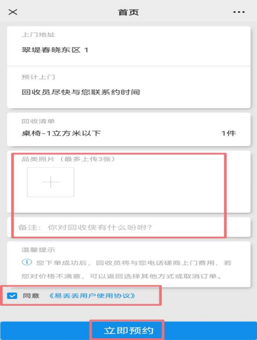 选择“品类”和“数量”,上传“品类照片”,勾选下方“同意”选项,点击“立即预约”即可