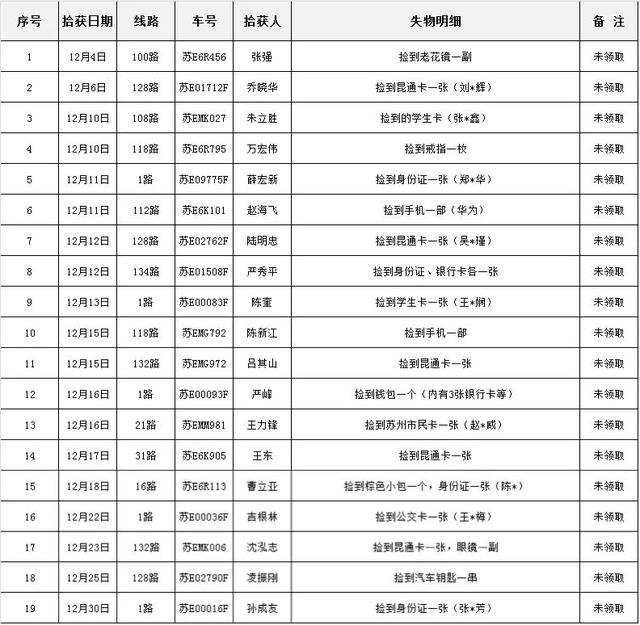 12月18日,公交100路驾驶员张昌江到站后发现座位上有一公务包,包内有笔记本电脑等重要物品,立即报备并交由车队保管。公交热线中心收到失主的来电,约定第二天在西需浦车队办公室领取失物。翌日,失主父亲来到车队领回了公文包,并对公交驾驶员拾金不昧的善举表示感谢。