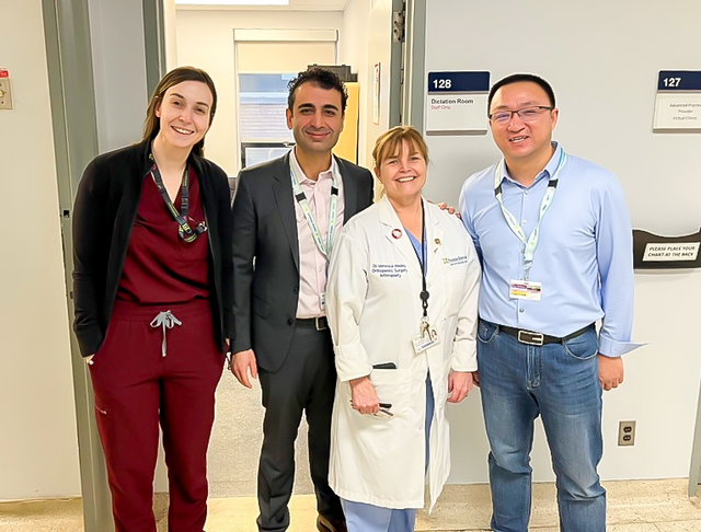 门诊日,也是比较早的,全面实行预约制,第一个病人,早上7点半就进门诊间等待了,所以门诊医生一早就准备起来了,和国内很大区别是,加拿大门诊是主诊教授带着助手、Fellow一起上,在检查室,由下级医生先接诊,在检查床边完成问诊、查体、检查(X片),然后教授过来,听取汇报后决定患者去留,需要手术的直接同患者进行术前谈话,由教授的秘书安排手术时间。