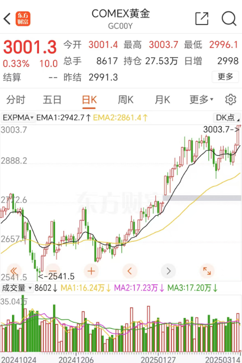 美国当地时间3月13日,国际黄金价格刷新历史新高,COMEX黄金期货涨穿3000美元/盎司关口,现货黄金价格也涨至2989美元/盎司上方,均为历史首次。