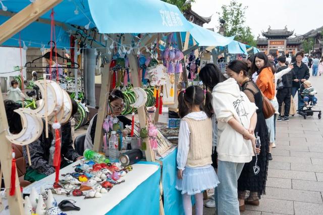 假日期间,全福南路设置了主题市集,推出青团、艾草糕等限定茶点;还有国风文创、手工香囊、簪花饰品、非遗漆扇等市集摊位,沉浸式体验咖香花市。