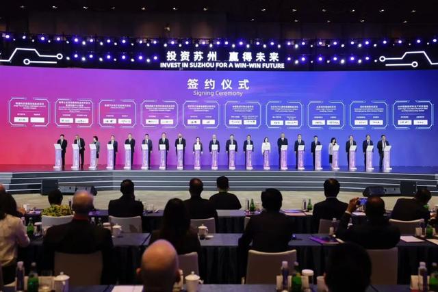 大会当天,昆山签约项目55个,计划投资总额441.8亿元,覆盖新一代信息技术、高端装备、新能源、新材料、生物医药及大健康、旅游服务、贸易服务等方面。其中,昆山全球光电未来新型显示创新中心、鑫泰利智能机器人、台光电子AI高性能覆铜板等5个项目上台签约。