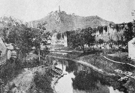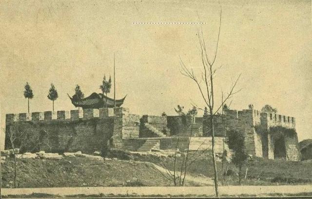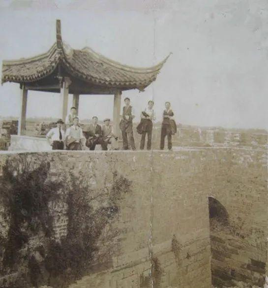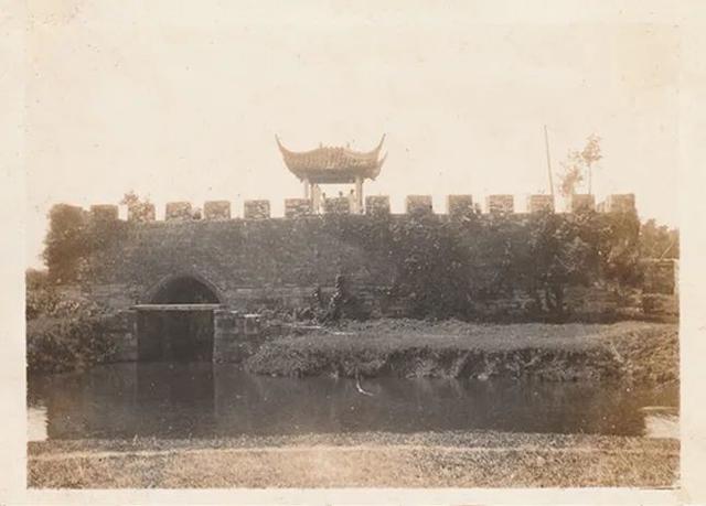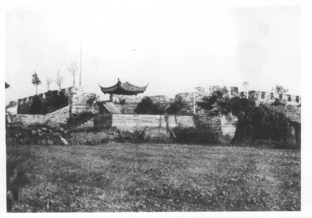 这里有三幅拱辰门旧影,留下了那时城门及城墙的壮丽景色,大致摄于20世纪30年代初,都是从玉峰东侧向下俯拍的鸟瞰远景,图片中都能看到坚固的城墙、厚实的城门、宽阔的城台,组合成蔚为壮观的城楼雄姿。而且在修缮城墙时还加固了“抗倭亭”,盼能成为富有教育意义的旅游胜景——抗倭亭曾见证了那段昆山军民抗击倭寇入侵的风云历史。凉亭只用四根石柱撑起,显得平淡无奇,只因有了抗倭意蕴而别有纪念意义。
