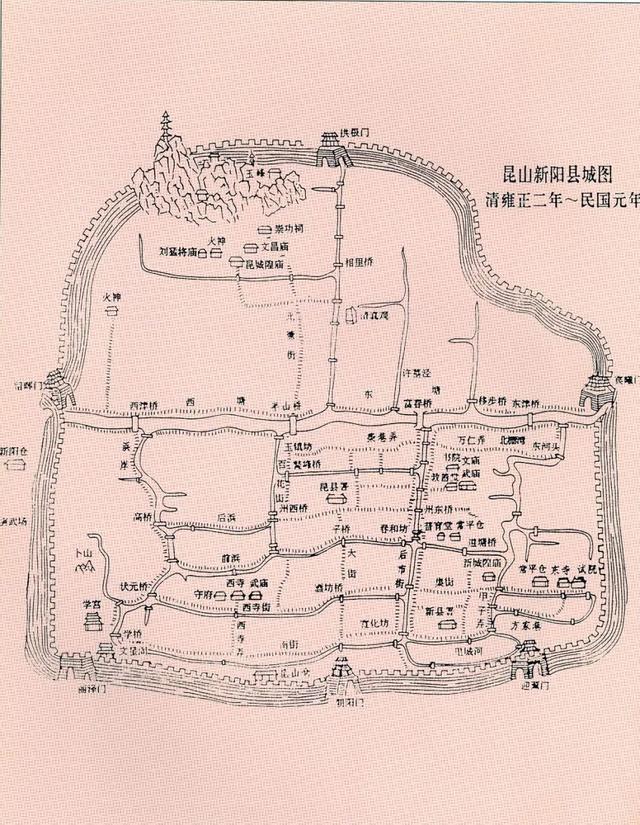 清雍正初年,实施了昆山和新阳两县同城分治管辖。乾隆、道光年间都曾编纂新志,由于两县本为一家,难以分割,所以共编《昆新两县合志》,城墙为两县共有,因此留下了一张那时清晰的城墙图(见上图)——