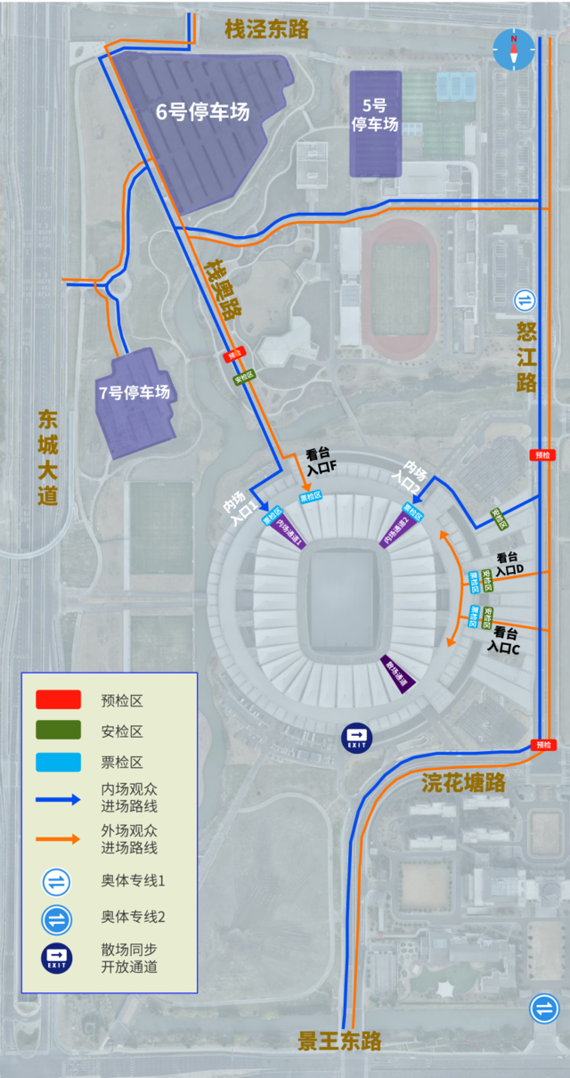 怒江路与浣花塘路交叉口、怒江路与蓬莱路交叉口为内场入口2和C/D看台、包厢入口的预检口;