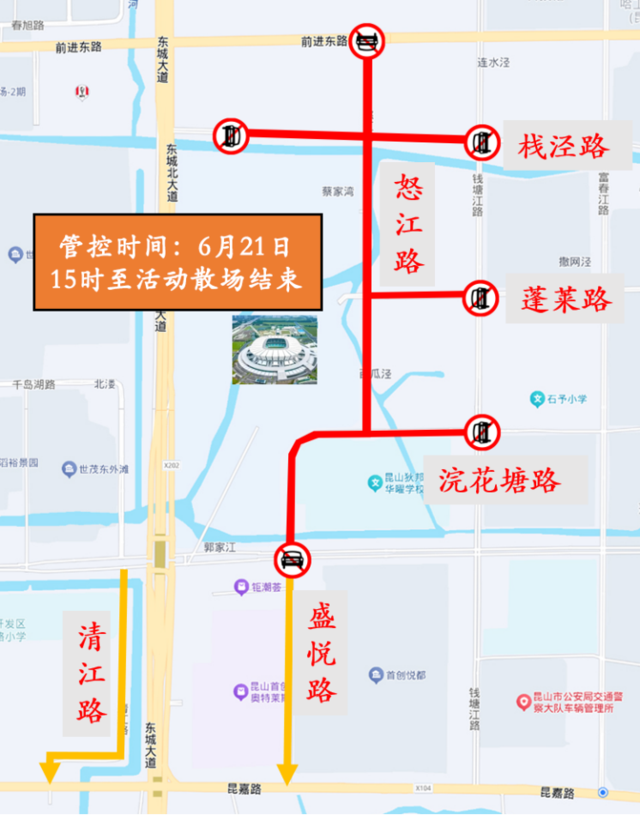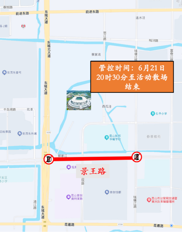 管控路段:昆嘉路东城大道、洪湖路东城大道路口临时实施东西向交通管控,禁止向南进入东城大道。