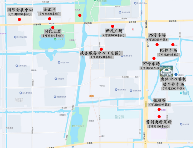 国际会展中心停车场(可用2000车位)、政务服务中心(东区)停车场(可用1500车位)、世茂广场停车场(可用1000车位)、奥体中心P6停车场(可用769车位)、钜潮荟停车场(可用600车位)、时代大厦停车场(可用410车位)、奥体中心P7停车场(可用254车位)、奥体中心P5停车场(可用234车位)、金汇丰停车场(可用200车位)、艺术宫停车场(可用150车位)、首创奥特莱斯停车场(可用100车位)。