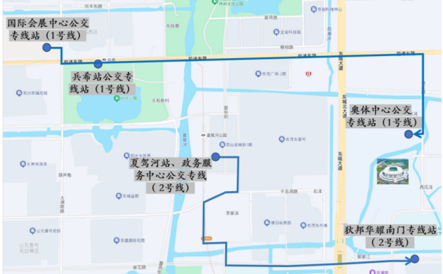 “奥体公交专线1”(北线):往返国际会展中心和奥体中心北侧公交首末站,途经轨交11号线兵希站,运营时间为2025年6月21日进场时段(16:00-19:00),散场时段(21:30-散场结束),循环开行。