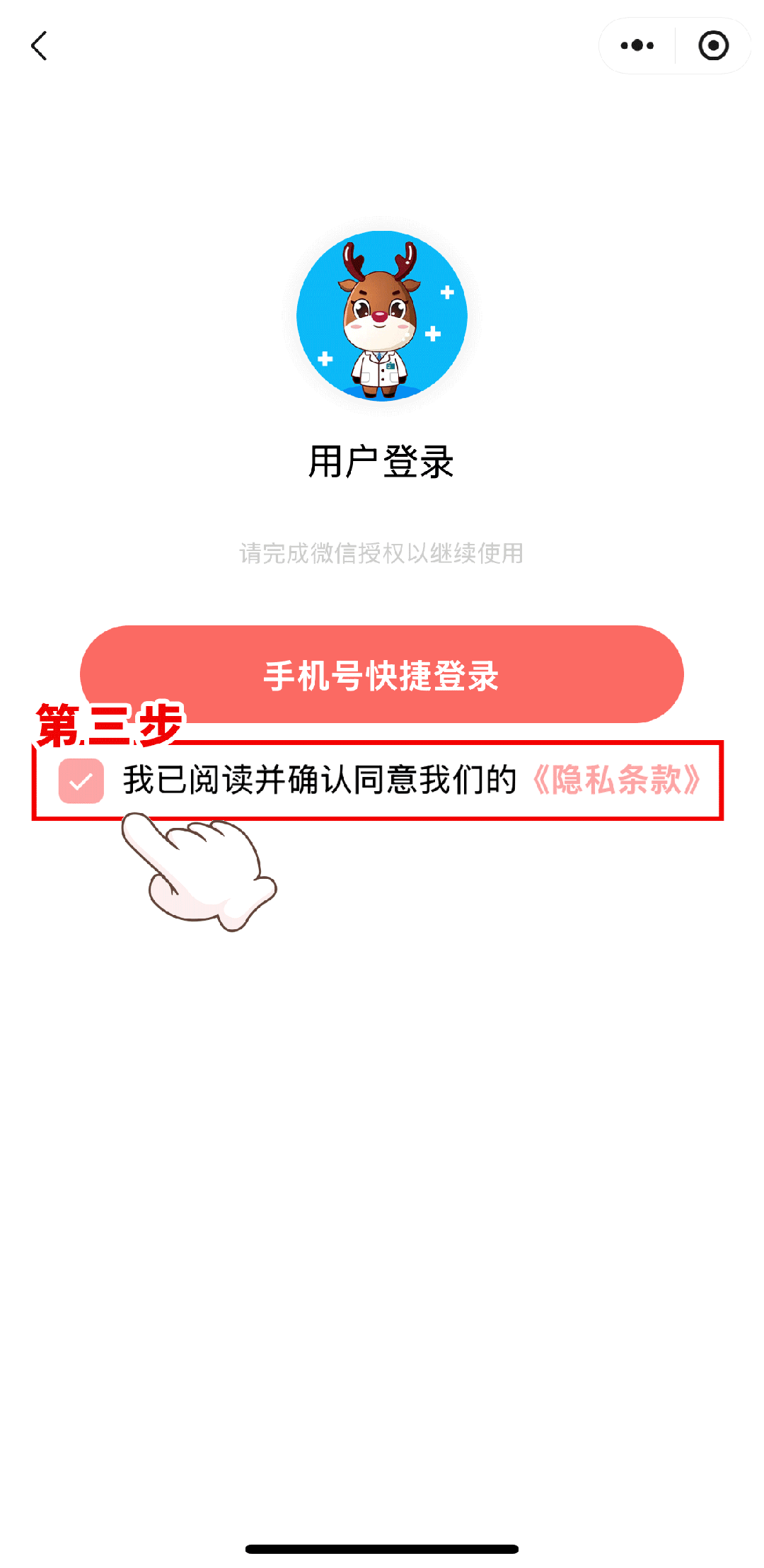 勾选“我已阅读条款”并点击“手机快捷登录”——点击手机号获取授权——注册完成