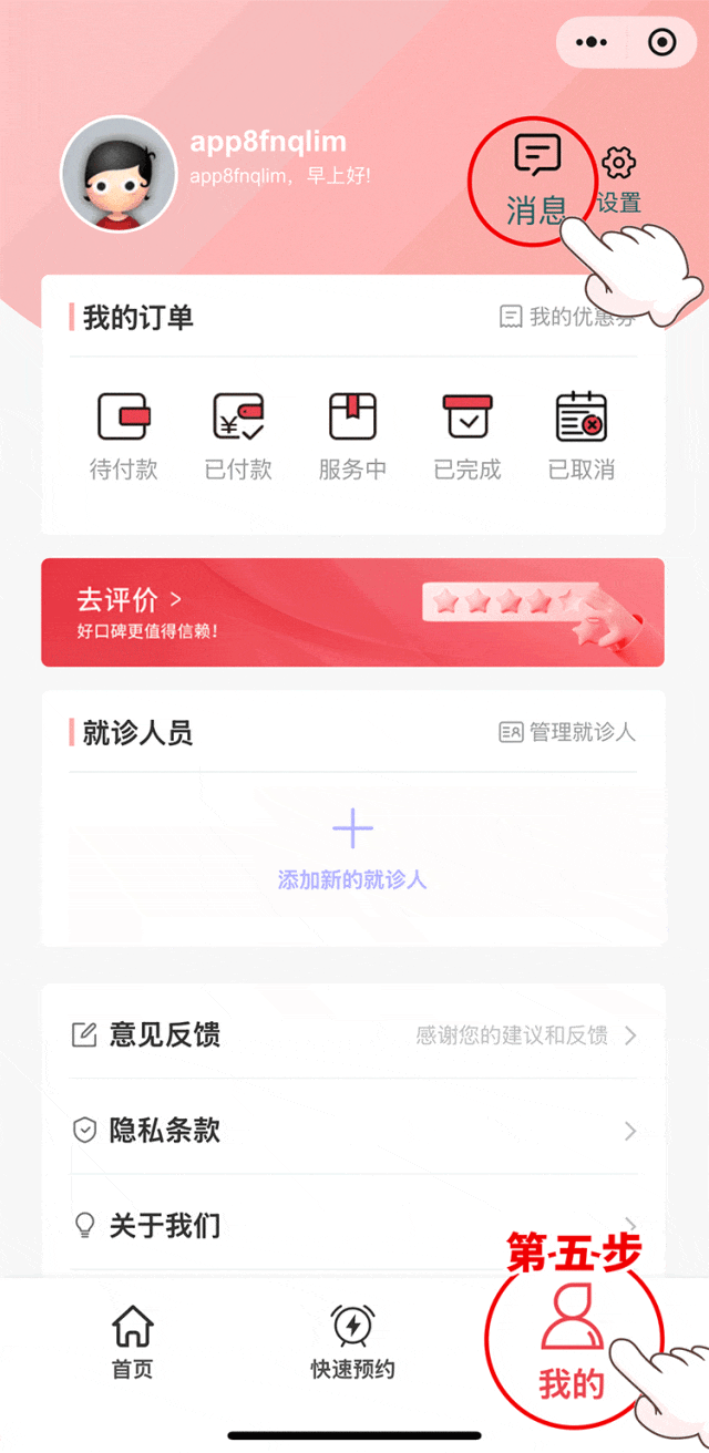 进入陪诊页面,点击右下角“我的”——点击左上角游客头像