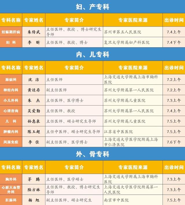 6月30日-7月6日长三角专家出诊一览表