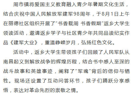 张浦镇依托村社区阅读阵地,结合暑托班和返乡大学生社会实践,积极主动对接社会组织资源,邀请返乡大学生录制红色音频,以声传情,带领群众重温峥嵘岁月,并组织大学生志愿者开展红色经典领读活动。7月16日,来自南京审计大学的刘同学在锦和社区通过生动讲述《小兵张嘎》中智斗敌人的精彩故事,带领儿童沉浸式感受革命年代的英雄气概;7月20日,在锦和社区解读《小英雄王二小》中的英雄情怀,让红色基因在代际传递中焕发新生。