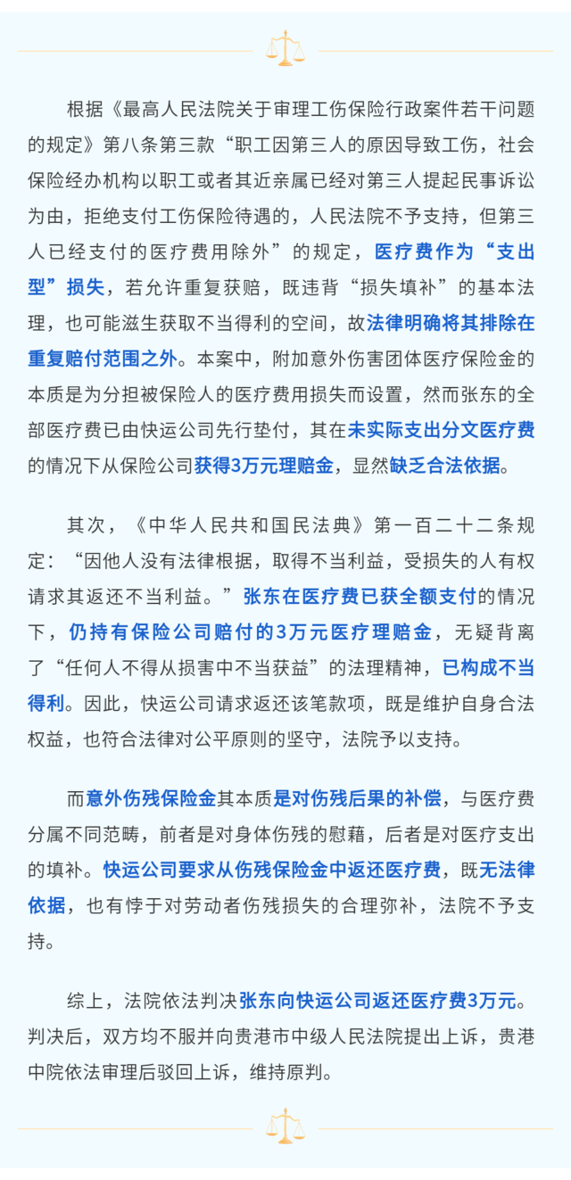 张东辩称,“保险是公司为员工购买的保障,凭啥扣我的钱?”其认为意外保险属于保障福利,应与工伤赔偿双重获赔。
