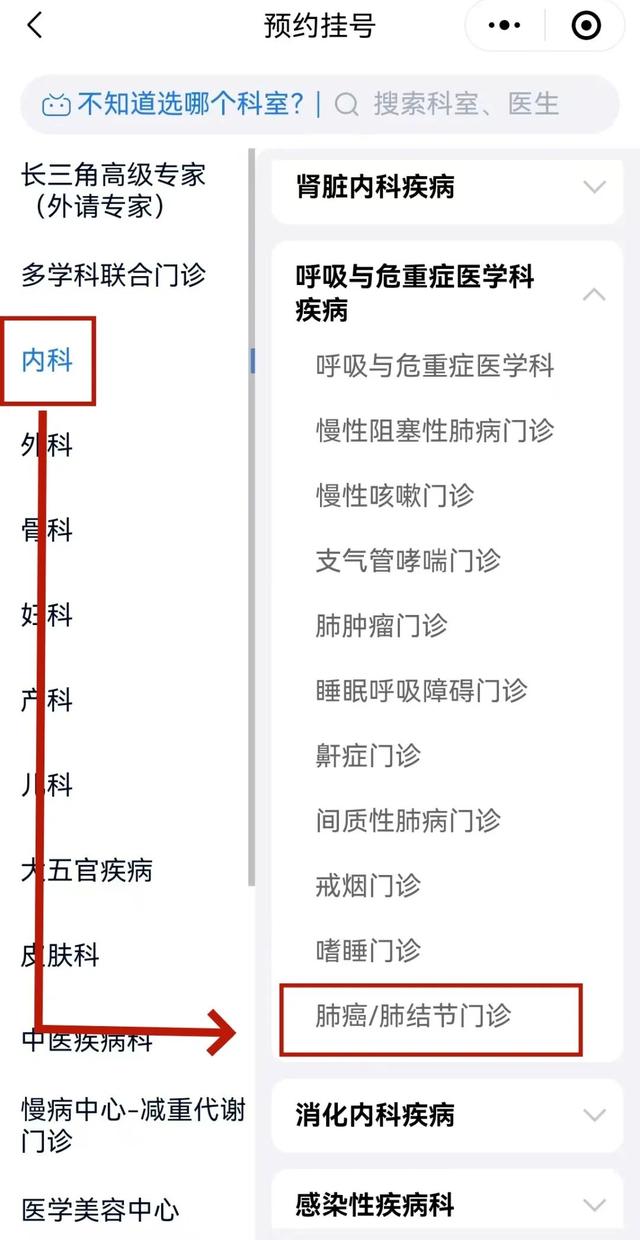 (2)或者进入“昆山市第一人民医院”小程序,点击“内科—呼吸与危重症医学科疾病—肺癌/肺结节门诊”,选择时间或专家即可预约。