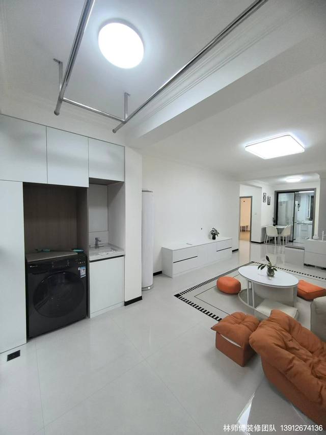 客厅与阳台之间没有装隔断门,而是直接打通,让阳台的光线自然涌入客厅,视觉上拉伸了空间长度。阳台一侧是橱柜,柜内收纳洗衣液、洗衣粉、清洁工具等,让阳台不再是 “杂物堆放区”,而是兼具洗衣、收纳功能的清爽空间。