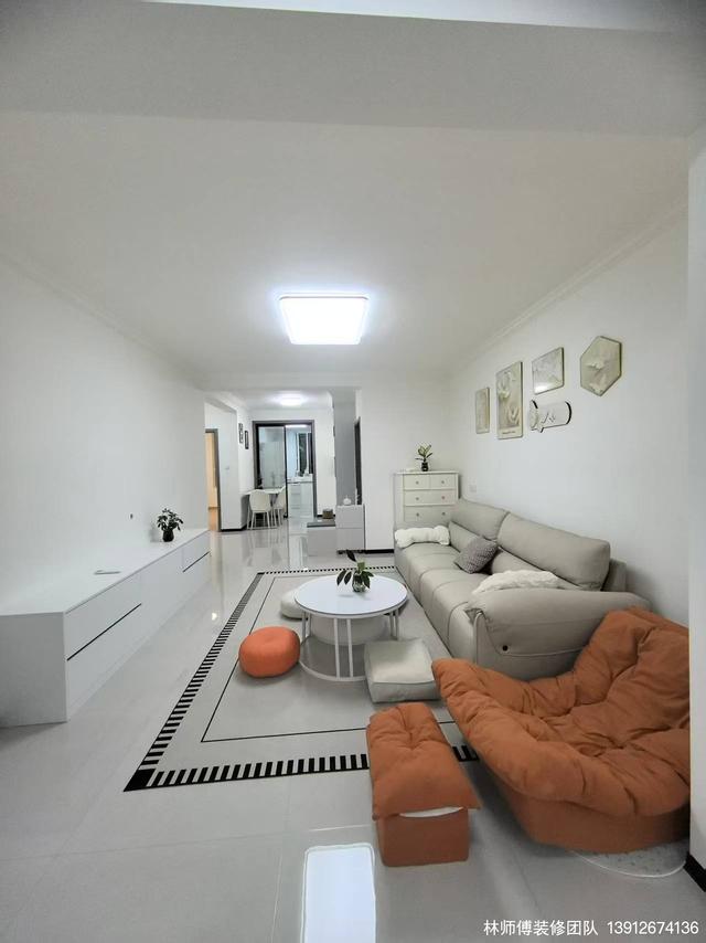 沙发墙没有做复杂造型,而是用几幅大小不一的清新照片做装饰,营造出文艺温馨的氛围。客厅角落摆放了一组橙色懒人沙发,亮眼的颜色打破了浅色系的单调,让空间瞬间有了层次感,平时窝在这里看书、追剧,既舒适又不占用过多空间。